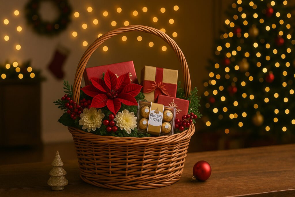 These gifts blend décor and practicality. A basket might include festive trinkets, candles, or small ornaments, while red-and-gold bouquets add elegance to living rooms and dining tables.