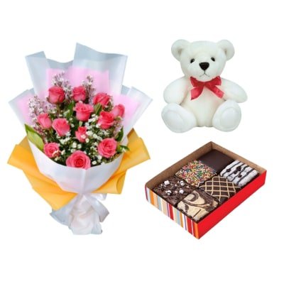 Combo Trio – 12 Pinks Roses Bouquet with Red Ribbon Fudgy Brownies and small teddy bear.