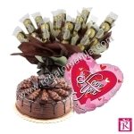 1 dozen of 3 pcs ferero boquet , a regular size cake from goldilocks or red ribbon and 1 mylar heart shape balloons
