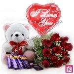 A one dozen of red roses , with small Teddy bear, four pcs 65 grams cadbury chocolates and a small mylar I love you balloons will make your love one always happy!.