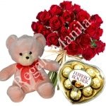 Always In My Mind combo gift. The classic romance of 2 dozen red roses with 18-inches teddy bear stuff toys and Ferrero Rocher chocolate heart can say so many things, from “I love you!” to “I’m sorry.” Stunning in its simplicity, elegant arrangement of deep combo gift.