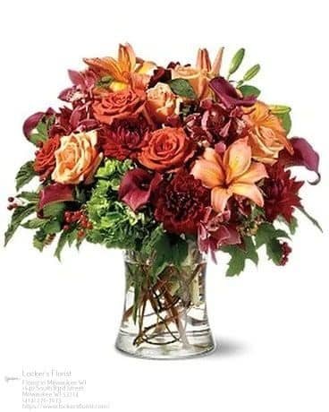 ½ A profusion of fall-toned flowers, including Asiatic lilies, roses, cymbidium orchids, miniature callas, hydrangea, dahlias and accents of viburnum berries and curly willow arrive tucked inside a clear glass gathering vase.