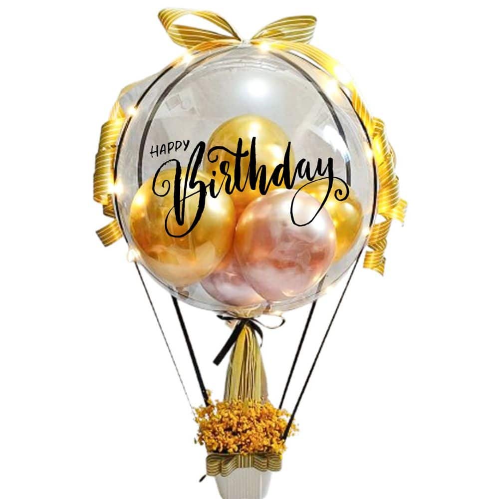 Make someone’s special day extra magical with this gold-themed hot air balloon arrangement! Featuring a transparent balloon filled with golden and pearl-toned mini balloons, adorned with elegant ribbons and fairy lights for a touch of luxury. 🎁🌟