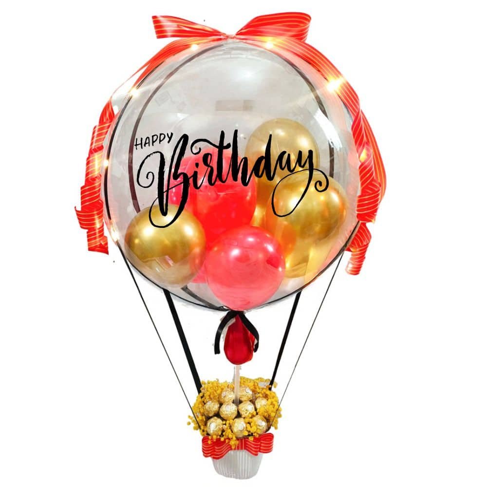 Make their special day extra magical with this elegant hot air balloon-inspired birthday gift! 🥳✨ Featuring a crystal-clear bubble balloon filled with vibrant gold and red mini balloons, stylish red ribbons, and a charming floral base with chocolates. 🌹🎁