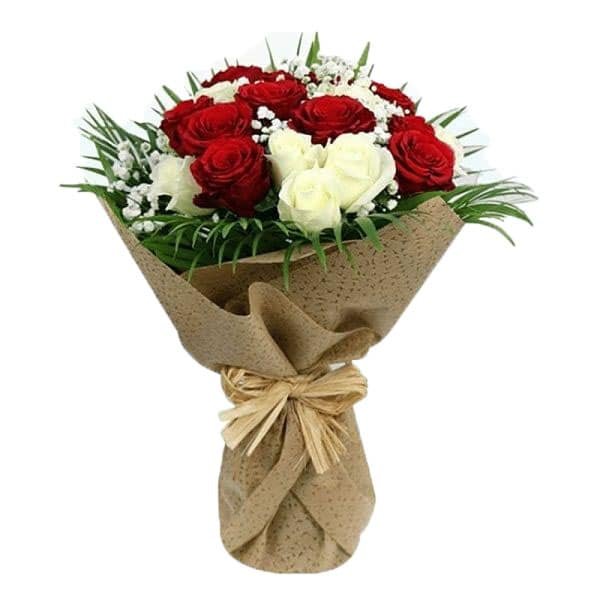 2 Dozen bright Red and White roses in an authentic bouquet.