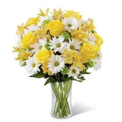A beautiful display of yellow, green and white fresh floral arrangement sure to add a touch of brightness to anyone’s day.