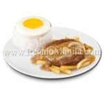 100% Pure Beef Yum Patty served with tasty fries, poured over with mushroom gravy and topped with toasted garlic bits and mushroom slices. Served with sunny side egg on top of steamed rice.