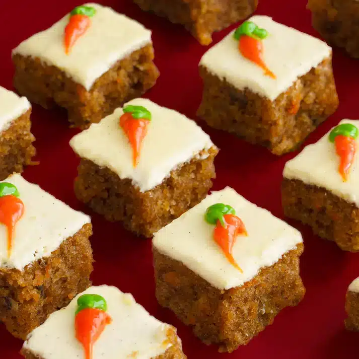 Carrot walnut bars with cream cheese frosting.Box of 25 pcs.