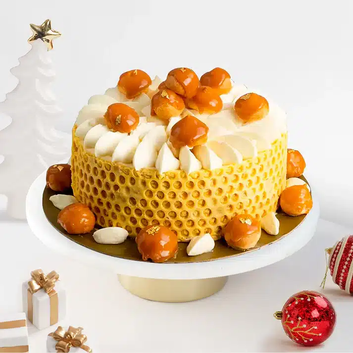 Layers of white chocolate mousse cake with honey-truffle oil, creme brulee and topped with crunchy pearls and soft profiteroles.