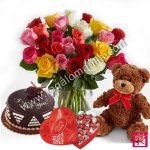 Complete any occasions with this combo gifts comes with 2 dozen assorted roses on vase, heart shape chocolate, small inches cute teddy bear and a regular size cake from goldilocks