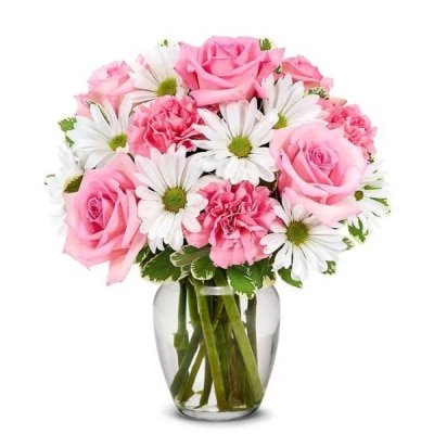 This special flower vase arrangement consists of Pink Roses (Deluxe and Premium Sizes Only), Pink Carnations, White Daisies and Seasonal Greens.
