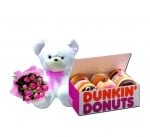 Add a sweetness of donut on your flower and stufftoys gits to complete this combo for your love one.Consist of 1 dozen pink roses, 1 small stuff toys, 1 dozen dunkin donuts
