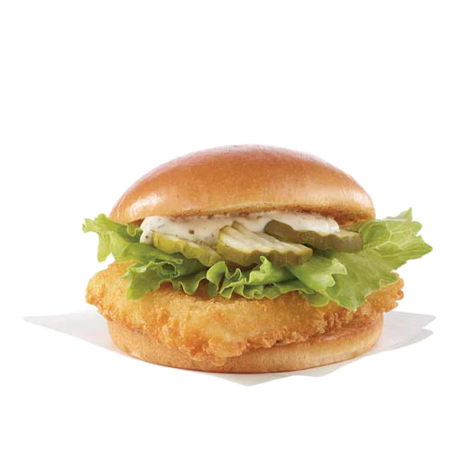Classic Alaskan fish fillet sandwich, with tartar sauce, pickles and lettuce on a toasted glazed bun.