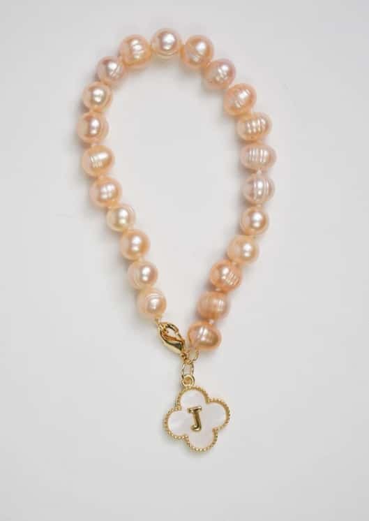 Freshwater Pearl Bracelet with Clover Letter Pendant in PeachFreshwater Pearl Bracelet with Clover Letter Pendant in Peach