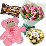 Blooms this beautiful 1 dozen tulip, hersheys chocolates,ferrero heart & 18inches stuff toys. This tantalizing friendship combo in soft spring colors of tulips make a thrilling thank you gift or sweet and innocent reminder of your love or friendship.