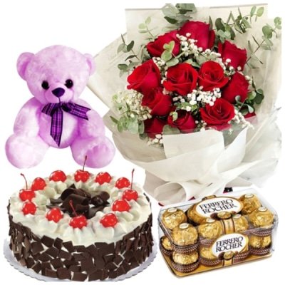 Red Ribbon’s chocolate Black Forest with a cherry twist, 1 dozen red rose, teddy bear and 16pcs ferrero rocher