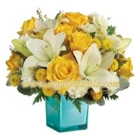 Inspired by the sunny sound of children’s laughter, this lighthearted bouquet of golden yellow roses, fragrant white lilies, white carnations and white button pompons is presented in a stunning vase. What a stylish way to make someone smile! Each arrangement is hand-created using the freshest flowers so colors and varieties may vary slightly while keeping the same look of the bouquet.