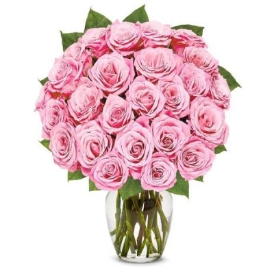This special flower vase arrangement consists of 1 dozen imported Pink Roses and Seasonal Greens.