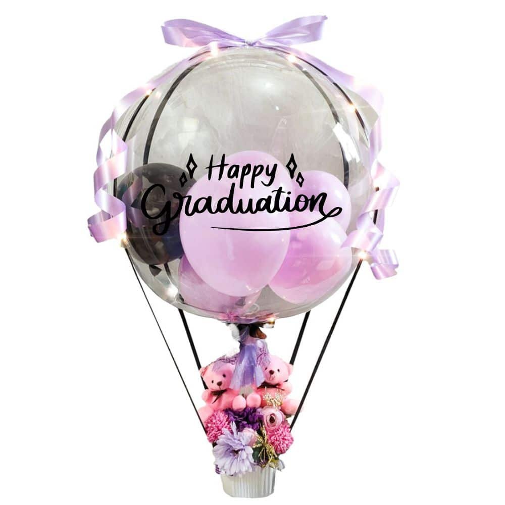 Celebrate their big achievement with this stunning Hot Air Balloon Graduation Gift! Featuring a crystal-clear balloon filled with soft pink mini balloons, adorned with adorable plush teddies, fresh flowers, and delicate ribbons. 🎁💖