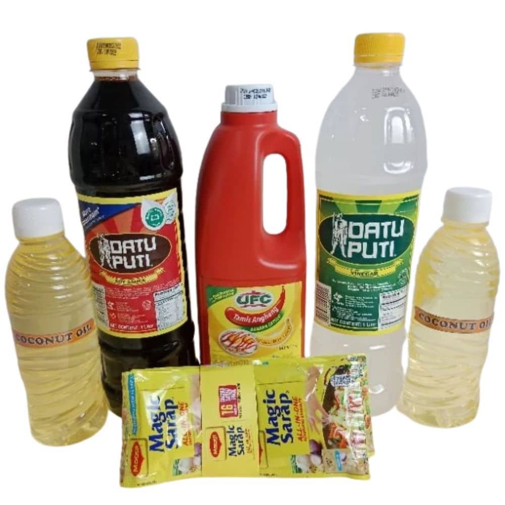 1 pc UfC Catsup 1kg 1 pc Datu Puti Soy Sauce 1 liter 1 pc Datu Puti Vinegar 1 liter 2 Plastic Bottle Coconut Oil 1 Pack Magic Sarap 16x8G