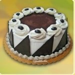 wo layers of Vanilla Chiffon Cake sprayed with Kahlua Coffee Liqueur, then filled with Tiramisu cream and chocolate shavings.The cake is iced with cream cheese then covered with chocolate triangle decors on the side and topped with cocoa powder, cream cheese rosettes with chocolate coffee bean decor.