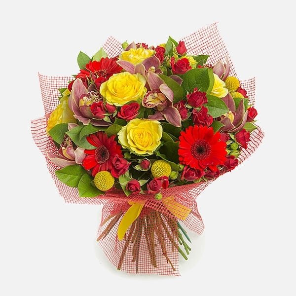 This is a delightful and heady splash of color to brighten up your room and lighten your day. A bouquet that hides the beauty and mystery of the mythical queen of the Minoans. We chose 7 yellow roses, 7 pink orchid flowers, 3 red gerberas, red mini roses and various foliage.