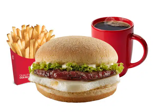 Made with sunny side up egg and caramelized longganisa patty all served on a freshly toasted pandesal bun with mayonnaise and lettuce, and comes with regular fries and brewed coffee.