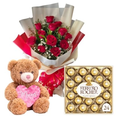 Love’s divine, this beautiful arrangement feature of 1dozen red roses in a vase with approximately 4fth stuff toys & 24ferrero chocolates is a timeless gift for your beloved.