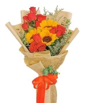 This Beautiful Bouquet consists of 3pcs sunflowers plus 12pcs red roses and Seasonal green filler. Nicely wrapped with premium paper and some filler with a beautiful ribbon.