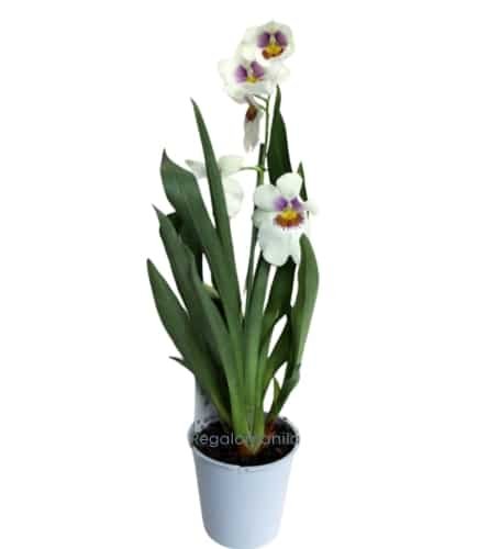 This Miltonia has a bright, white flower with a purple and yellow heart. Since the Miltonia’s flowers resembles a violet, it is also known as Violet Orchid. The country of origin is Colombia . It grows there on the river banks.