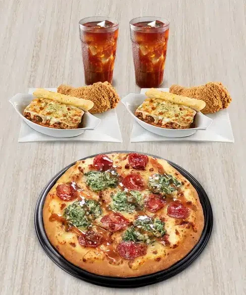 Enjoy our creamiest Honey-Glazed Spinach & Pepperoni Pizza (9″) with the bestseller, Lasagna Chicken Combo. The perfect meal for two!