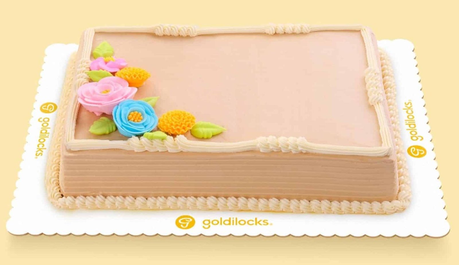Moist vanilla and choco marble cake with vanilla frosting topped with colorful candy flowers. Good for 18