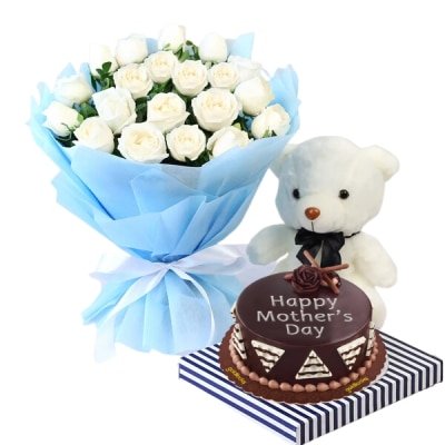 This combo gifts come with 1 dozen white roses, small teddy bear, a regular size red ribbon cake.