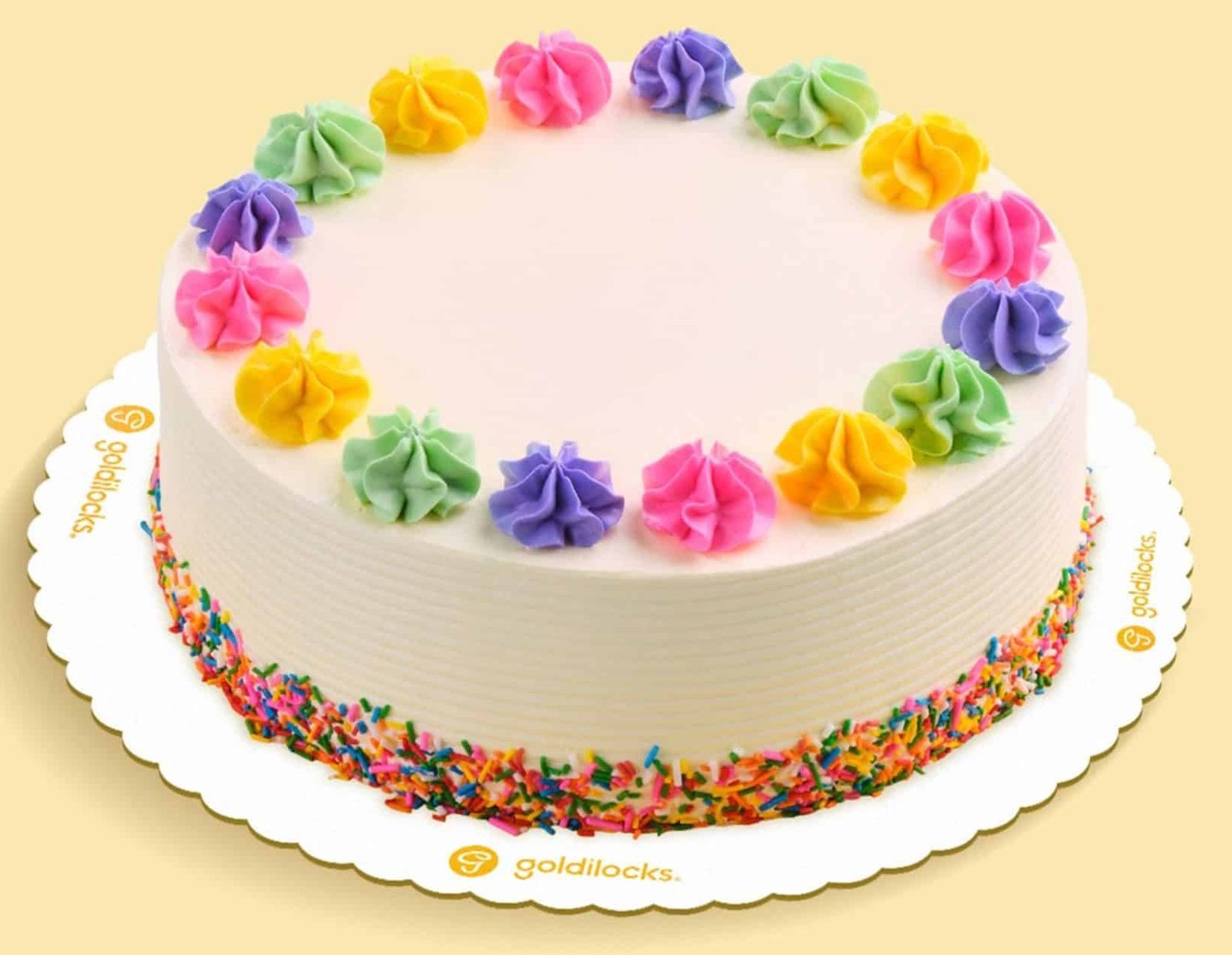 Three layers of ube, vanilla and strawberry chiffon cake filled with ube and strawberry buttercreme, covered with vanilla icing. Topped with rainbow colored rosette and more colorful with sprinkles.