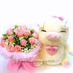 one dozen pink roses in bouquet with 12 inch piggy doll.
