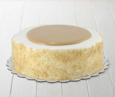 Vanilla sponge cake made with layers of salted caramel, crisps and butterscotch brownies, topped with dulce custard, and finished with dustings of ground cookies.