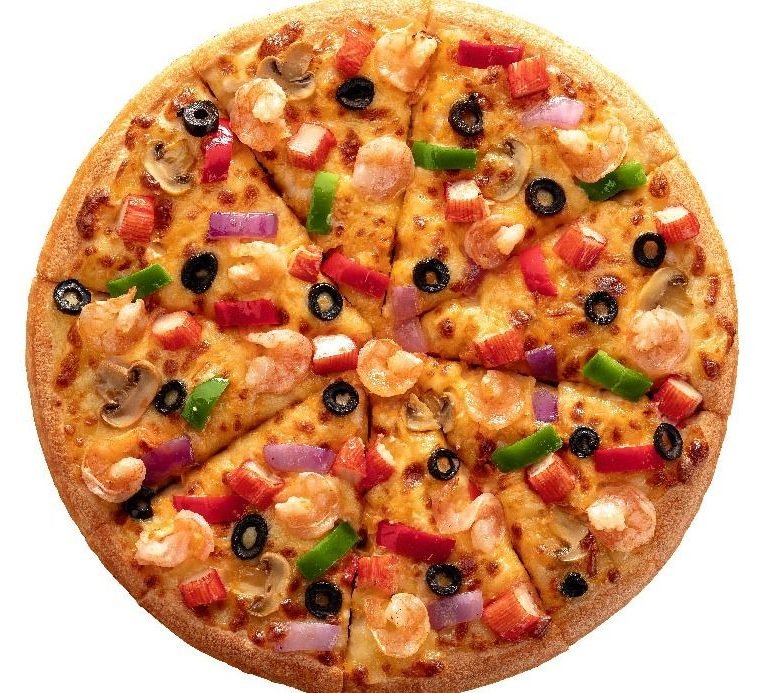 Meat-free pizza! Made with shrimp, crabsticks, black olives, veggie mix, thousand islands dressing, and mozzarella cheese.