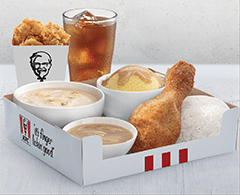 Load up with a complete meal in a box: 1 piece of our signature Original Recipe or Hot and Crispy chicken, Hotshots or Funshots, Mashed Potato, Mushroom Soup, steamed rice, and your choice of drink.