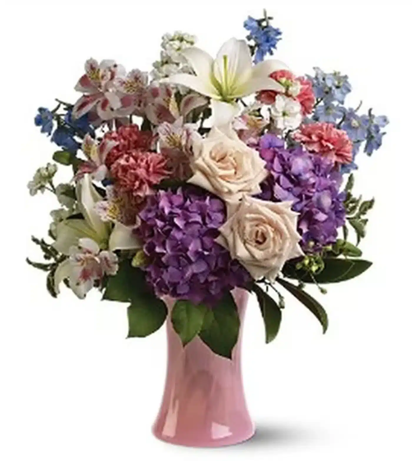 When there’s something special to celebrate – and you’d like to send the right bouquet – this marvelous mix of fresh flowers is simply gorgeous! A blend of blossoms in shades of white, purple, pink and blue creates a floral gift that’s appropriate for any.