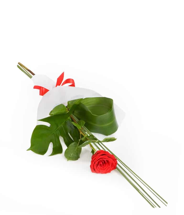 A simple, beautiful gesture of love, a single stem red rose. Subtle, elegant and seductive: this single red rose tastefully appointed by complimentary greens makes a simple point very effectively, and is always much appreciated by sophisticated flower lovers.