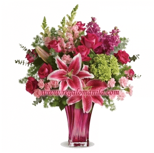 When spoiling her is the name of the game – steal the spotlight with this magnificent arrangement! Hand-delivered in a glorious glass blown vase, this luxe bouquet of fragrant pink stargazer lilies, pink snapdragons pink roses, and pink carnations will truly take her breath away