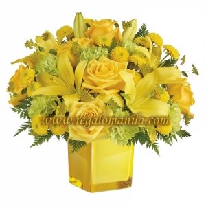 An instant pick-me-up! Beautifully arranged in a vase, these radiant yellow roses, lilies, and are accented with green carnations, creating a bouquet that will deliver smiles and sunshine, any day of the week. Each arrangement is hand-created using the freshest flowers so colors and varieties may vary slightly while keeping the same look of the bouquet.