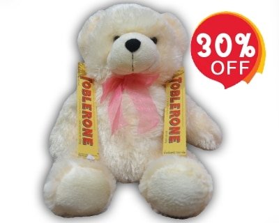 One super cute soft teddy bear with two bars of toblerone 100 gms each all comes in a very special price.