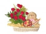 12 stems red roses, 6 inch teddy bear and toblerone chocolate,8 pcs ferrero in a heart shape.
