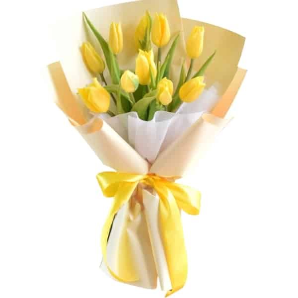 The tulip stands for perfect love and each shade expresses some emotion of life. A yellow tulip shows warmth. Send this 12 pcs tulip  yellow bouquet to your loved one. Let her feel you are there.
